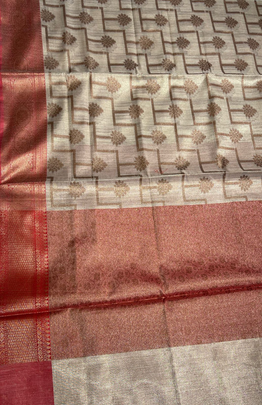 Faishana Presents Handwoven Beige Baswada Tissue Floral Resham Stripe with Contrast Red Zari Border and Red Blouse Banarasi saree