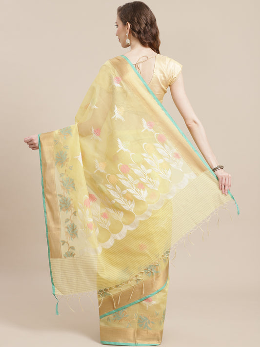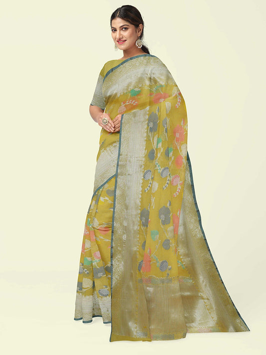 Faishana Presents Yellow Masrise Cotton Tilfi Jaal Zari Border With Yellow Blouse Banarasi Saree