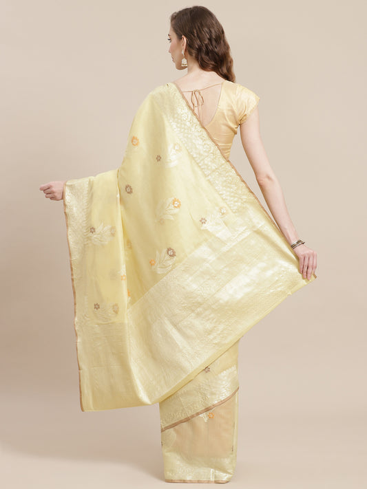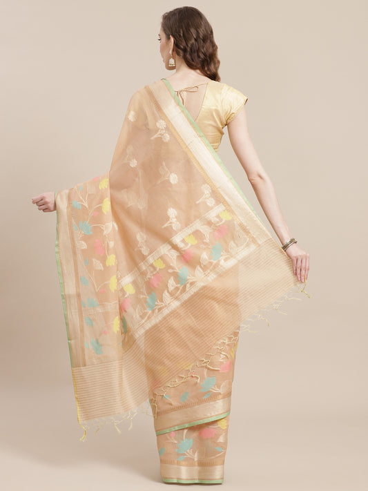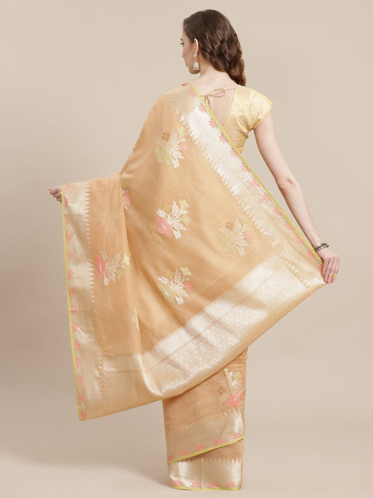Faishana Presents Handwoven Beige Masrise Cotton Tilfi Boota Zari Border With Cheeku Color Blouse Banarasi Saree