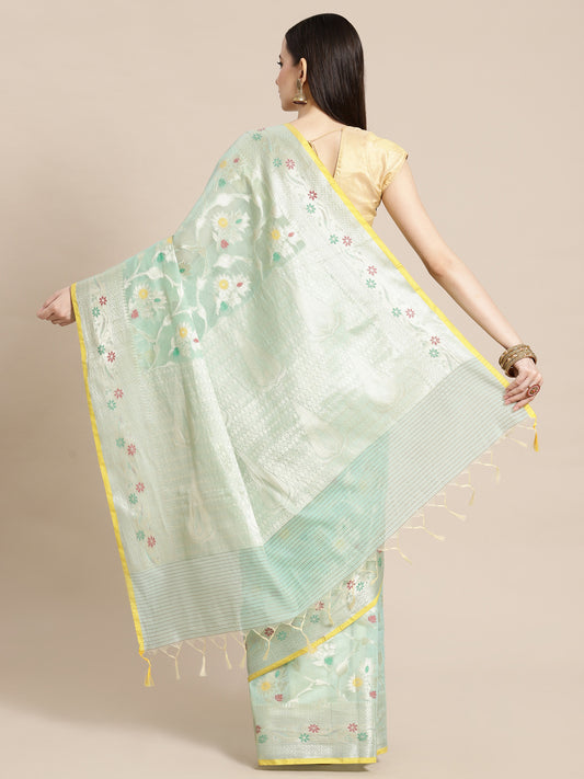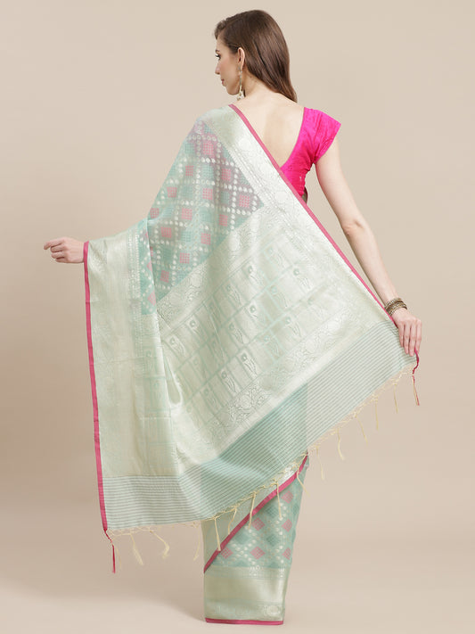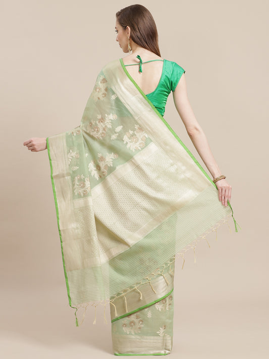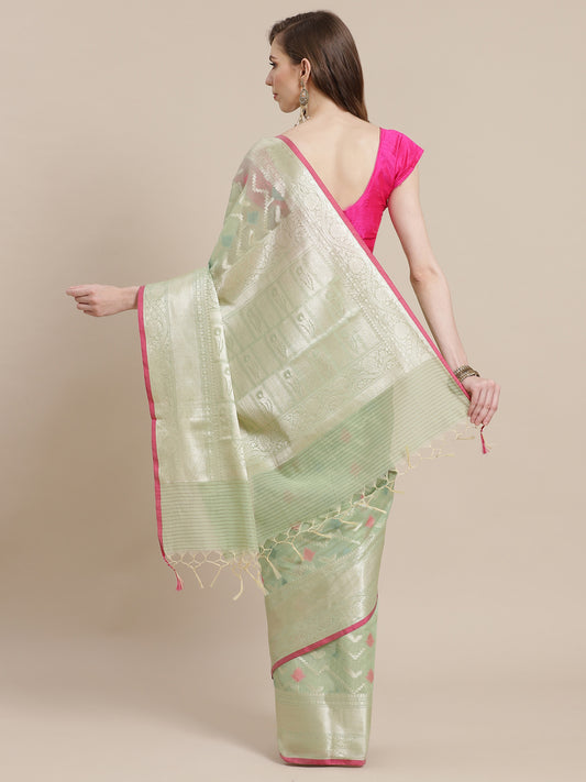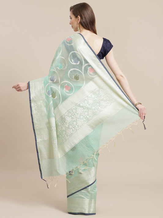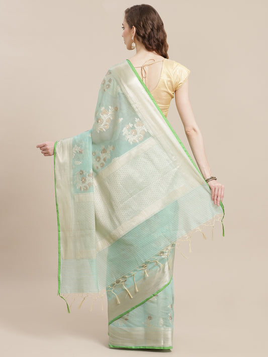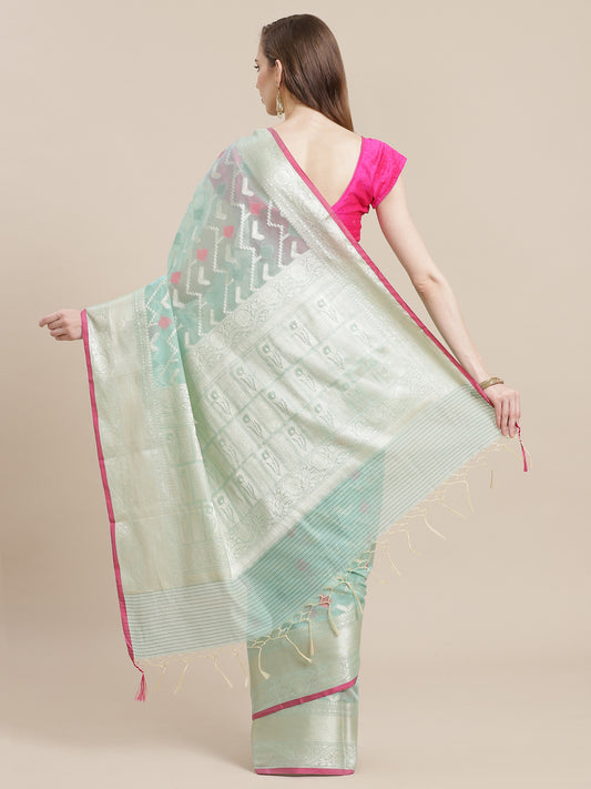 Faishana Presents Handwoven Seagreen Masrise Cotton Tilfi Jaal Zari Border With Green Blouse Banarasi Saree