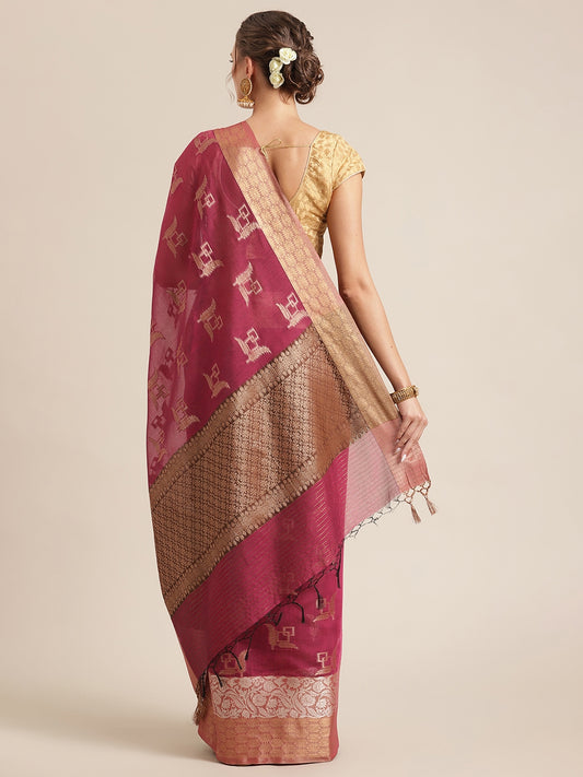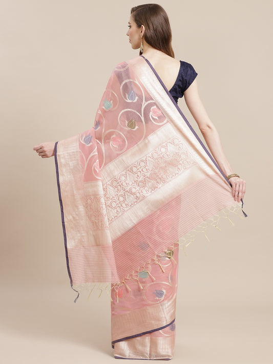 Faishana Presents Handwoven Pink Masrise Cotton Tilfi Jaal Zari Border With Pink Blouse Banarasi Saree