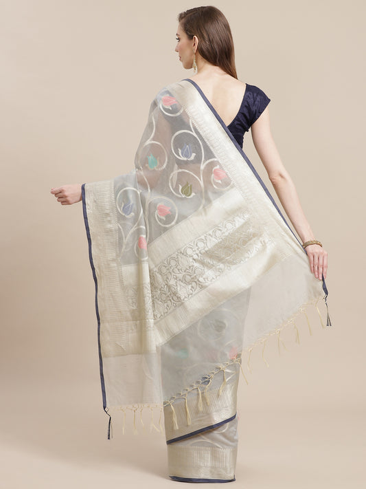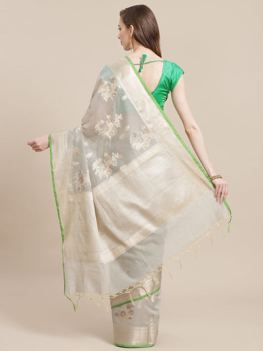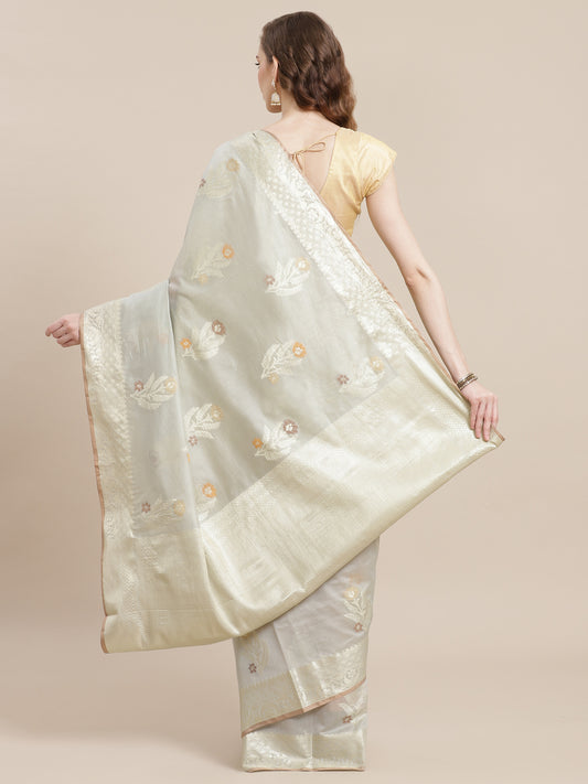 Faishana Presents Handwoven Grey Masrise Cotton Alfi Boota Zari Border With Grey Blouse Banarasi Saree