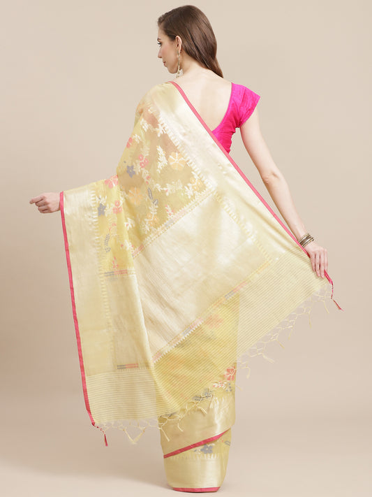 Faishana Presents Handwoven Yellow Masrise Cotton Tilfi Jaal Zari Border With Yellow Blouse Banarasi Saree