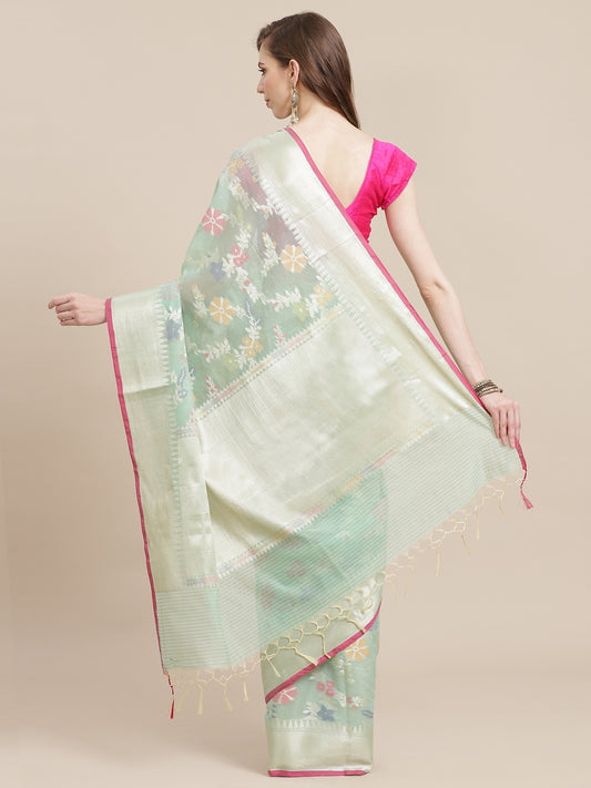 Faishana Presents Handwoven Seagreen Masrise Cotton Tilfi Jaal Zari Border With Seagreen Blouse Banarasi Saree