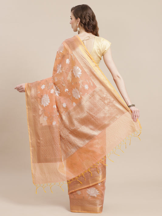 Faishana Presents Handwoven Peach Masrise Cotton Triangle Boota Skirt Border With Peach Blouse Banarasi Saree