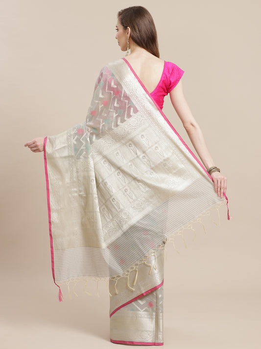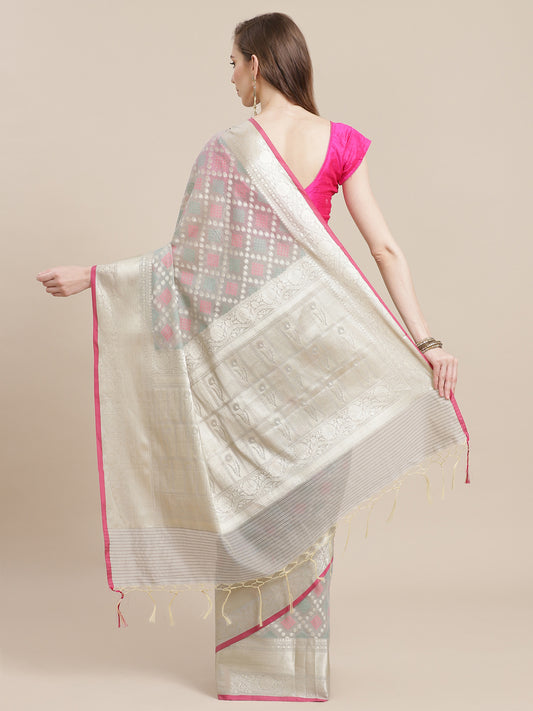 Faishana Presents Handwoven Grey Masrise Cotton Tilfi Boota Zari Border With Cheeku Color Blouse Banarasi Saree