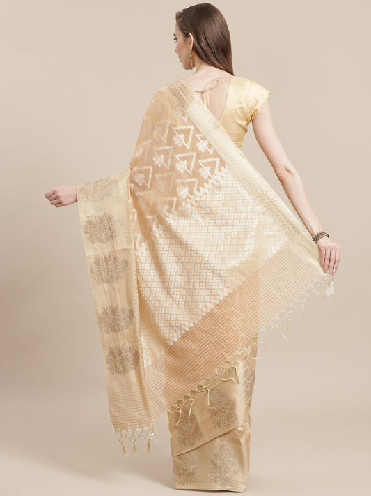 Faishana Presents Handwoven Beige Masrise Cotton Alfi Jaal Zari Border With Beige Blouse Banarasi Saree