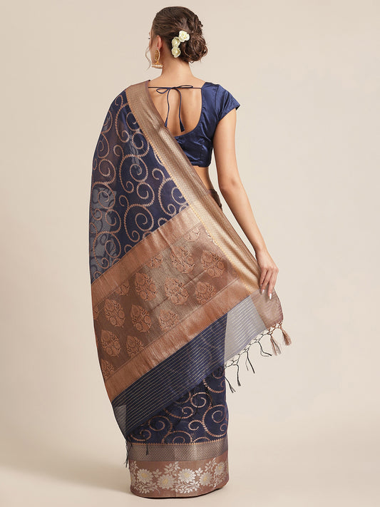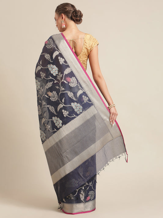 Faishana Presents Handwoven Navy Blue Masrise Cotton Tilfi Jaal Zari Border With Saree With Magenta Blouse Banarasi Saree