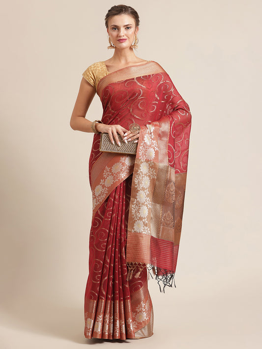 Faishana Presents Handwoven Red Masrise Cotton Jaal Alfi Skirt Border With Brown Blouse Banarasi Saree