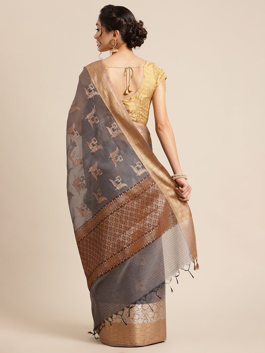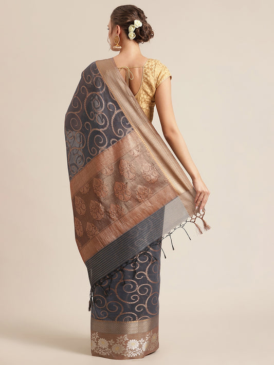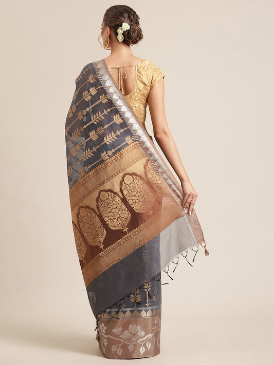 Faishana Presents Handwoven Grey Masrise Cotton Boota Skirt Border With Cheeku Brown Color Blouse Banarasi Saree
