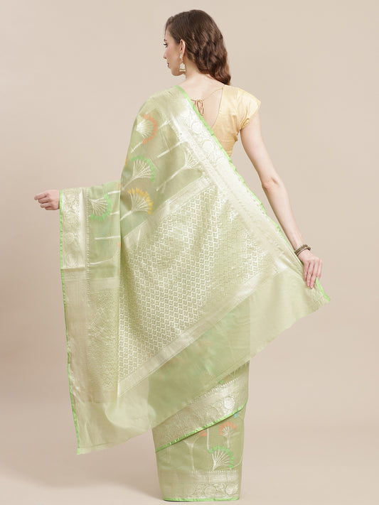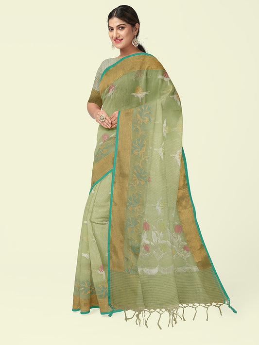 Faishana Presents Pistachio Masrise Cotton Tilfi Zari Border With Pistachio Blouse Banarasi Saree