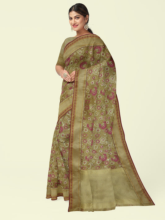 Faishana Presents Greenish Woven Organza Magenta Border With Magenta Blouse Banarasi Saree
