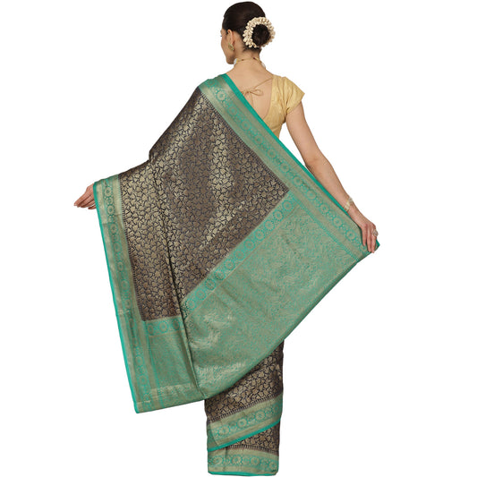Faishana Presents Black Katan Zari Brocade Saree With Kadiyal Green Contrast Border Banarasi Saree