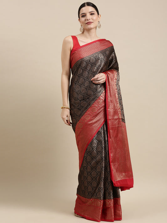 Faishana Presents Black Katan Zari Brocade Saree With Kadiyal Contrast Red Border Banarasi Saree