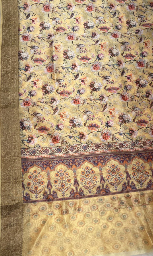 Faishana Presents Yellow Warm Silk Floral Digital Print Tilfi Jaal Copper Zari Border Banarasi Saree with Floral Print Booti Yellow Blouse