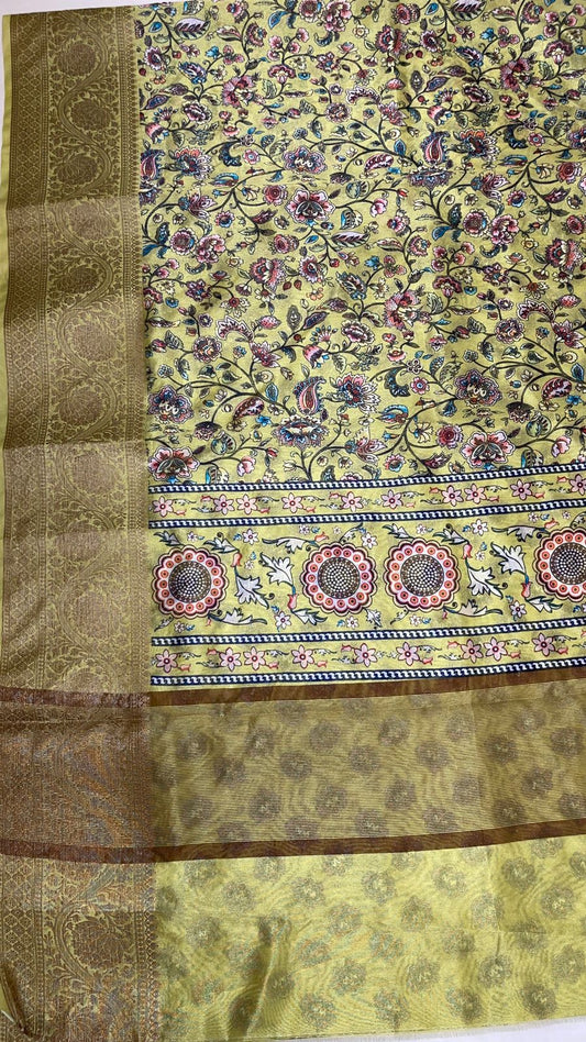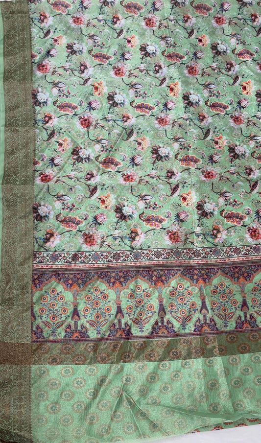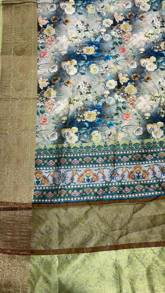 Faishana Presents Pista Green Warm Silk Floral Digital Print Copper Zari Border Banarasi Saree with Floral Print Booti Pista Green Blouse