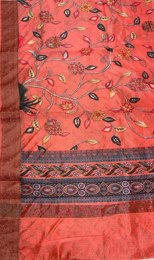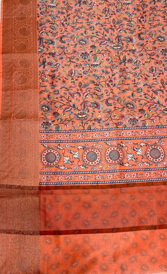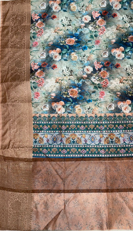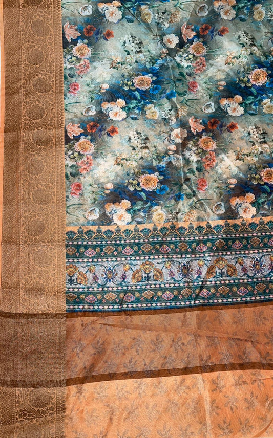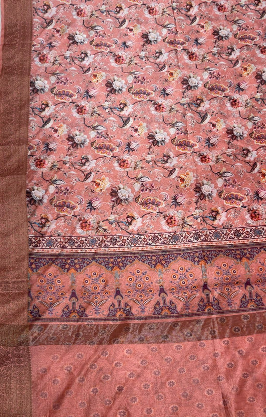 Faishana Presents Peach Warm Silk Floral Digital Print Copper Zari Border Banarasi Saree with Floral Print Booti Peach Blouse
