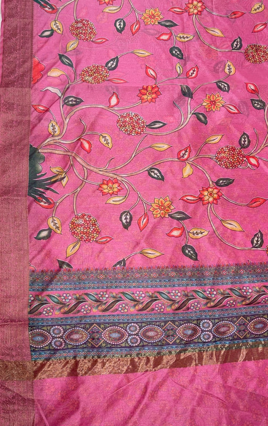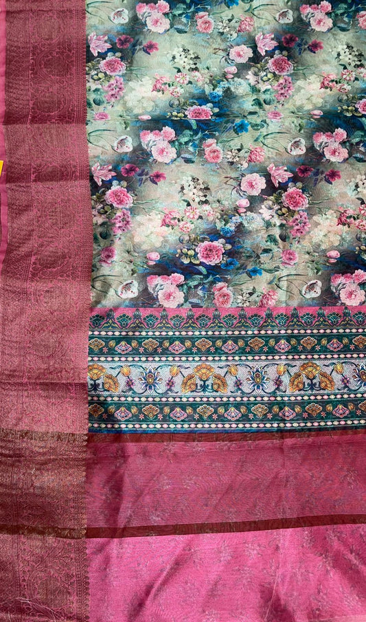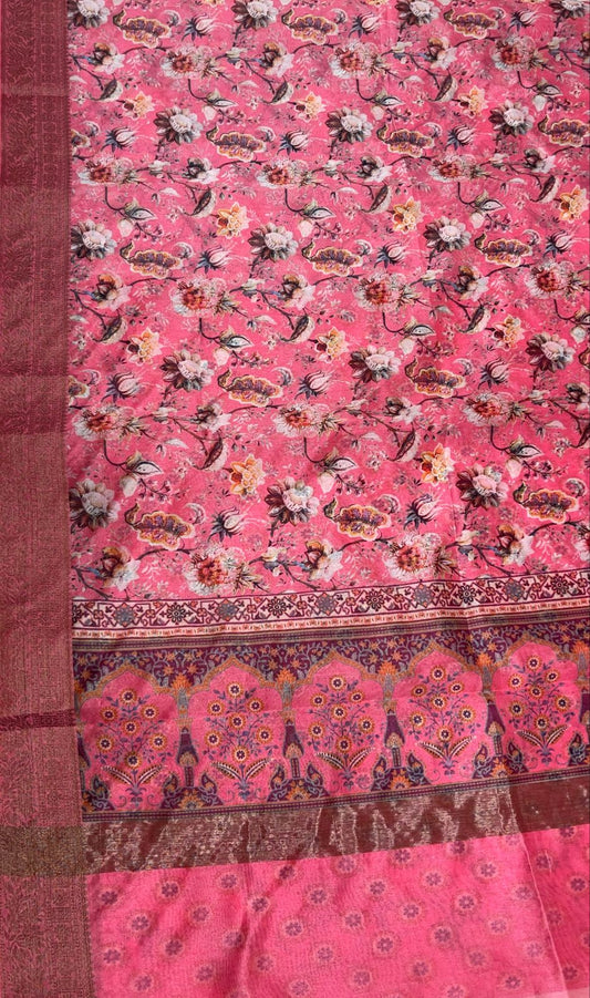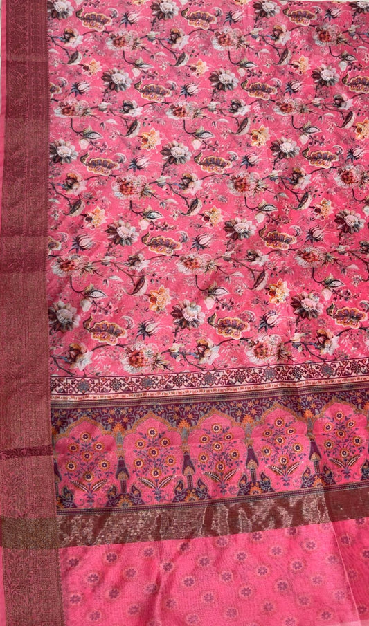 Faishana Presents Pink Warm Silk Floral Digital Print Copper Zari Border Banarasi Saree with Floral Print Booti Pink Blouse