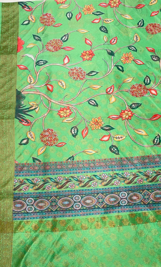 Faishana Presents Green Warm Silk Floral Alfi Jaal Digital Print Copper Zari Border Banarasi Saree with Green Chunri Booti Blouse