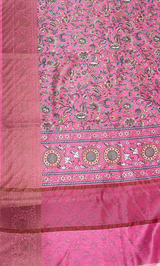 Faishana Presents Pink Warm Silk Floral Alfi Jaal Digital Print Copper Zari Border Banarasi Saree with Pink Chunri Booti Blouse