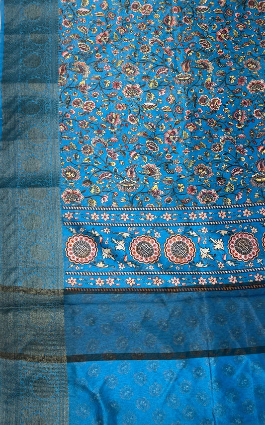 Faishana Presents Warm Silk Floral Digital Print Tilfi Jaal Copper Zari Border Banarasi Saree with Floral Print Booti SkyBlue Blouse