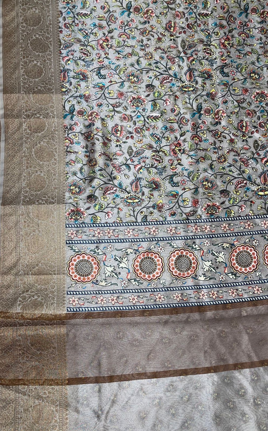 Faishana Presents Grey Warm Silk Floral Digital Print Tilfi Jaal Copper Zari Border Banarasi Saree with Floral Print Booti Grey Blouse