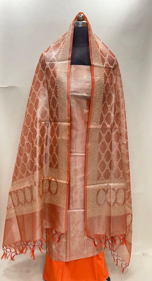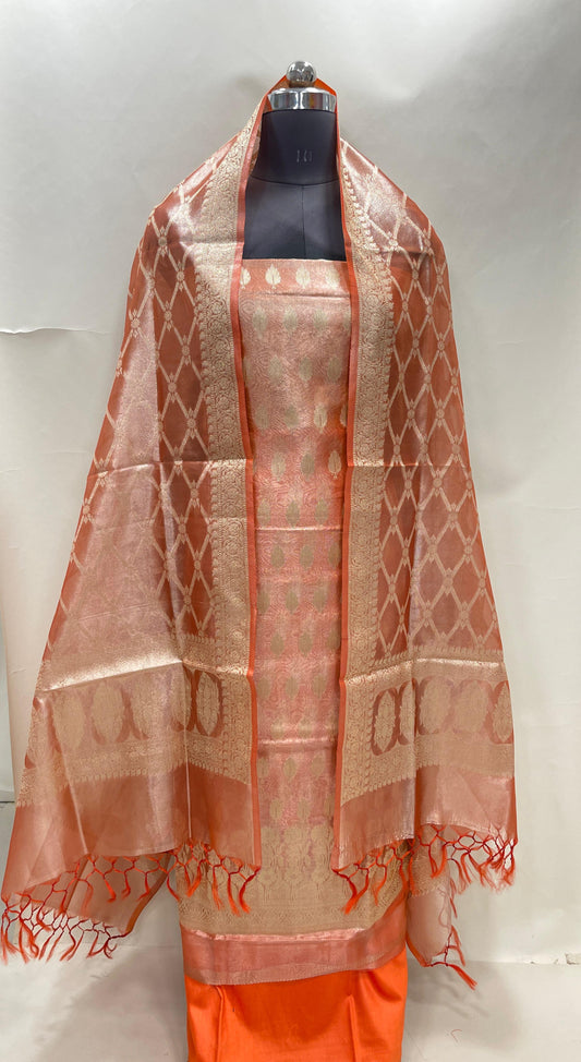 Faishana Orange Tissue Silk Suit with Floral Zari Booti Plain Bottom & Checkered Stripe Dupatta SHL_101