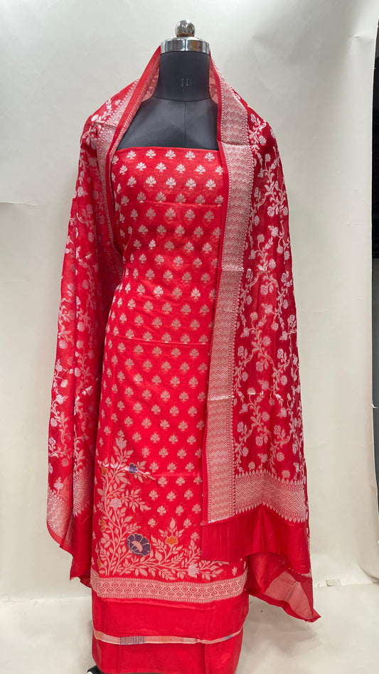 Faishana Red Semi Georgette Suit with Floral Ikkat Mina Border Plain Bottom and Zari Jaal Dupatta SHL_105