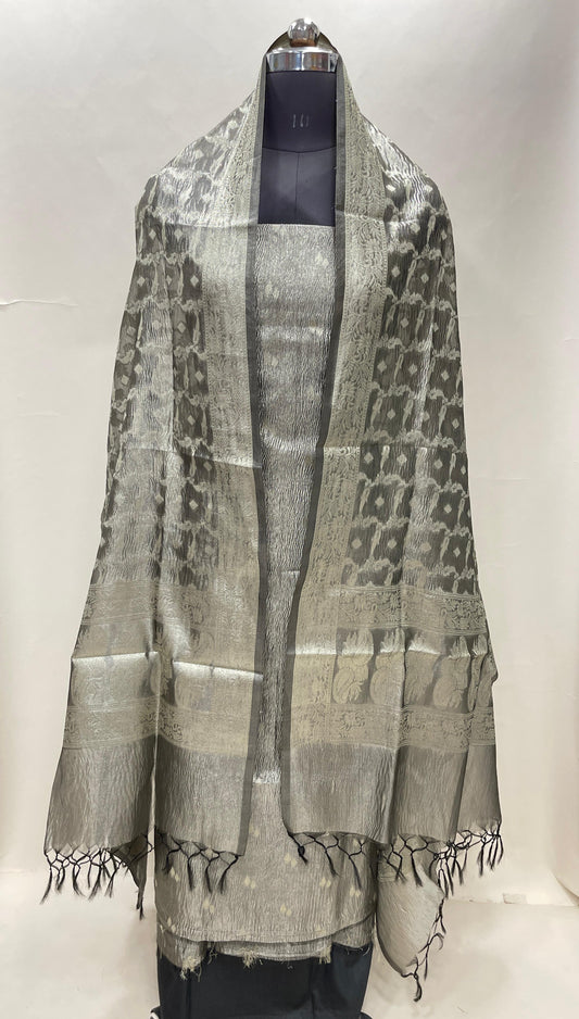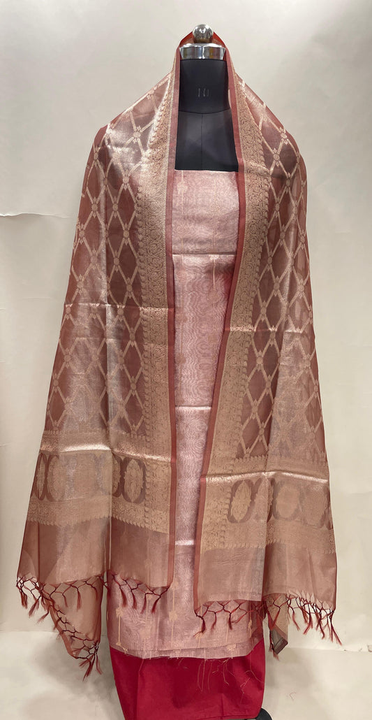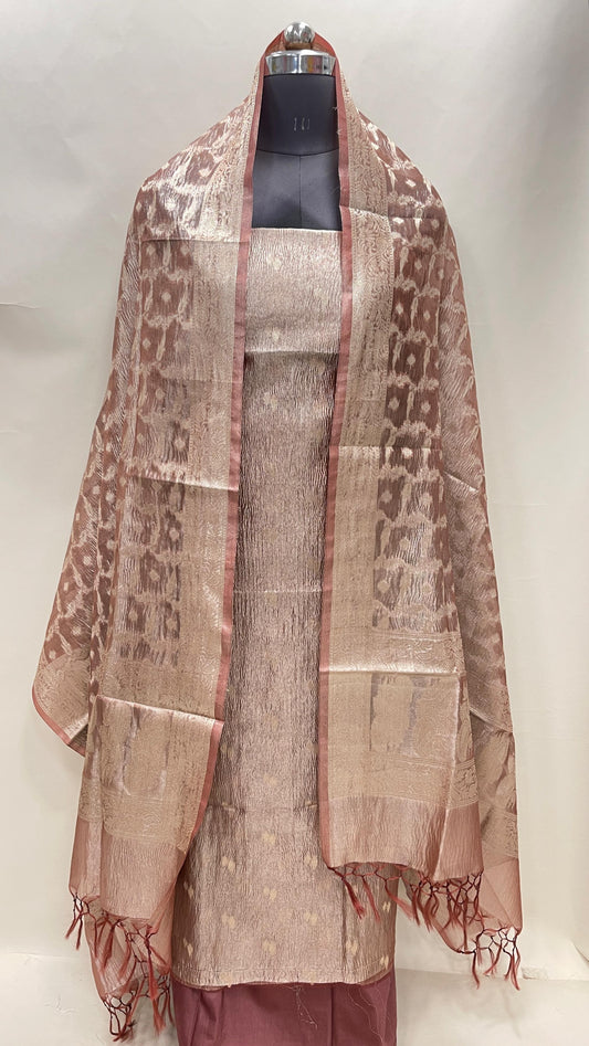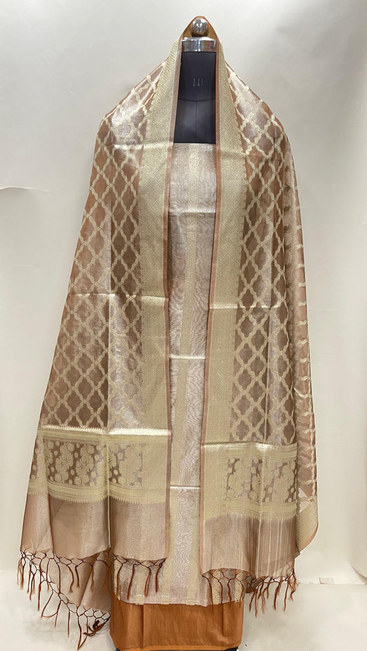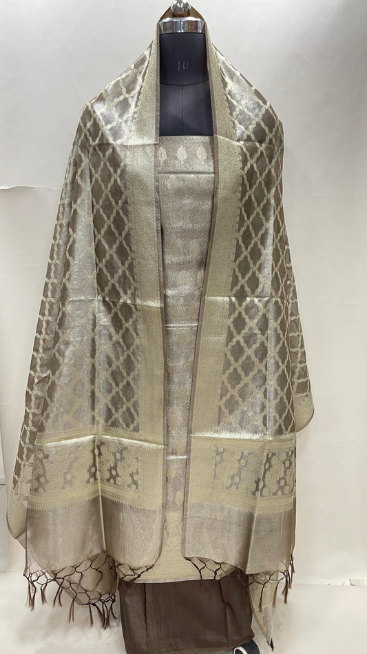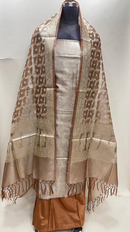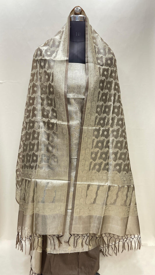 Brown tissue silk suit set with floral zari stripe and carry dupatta. SHL_78