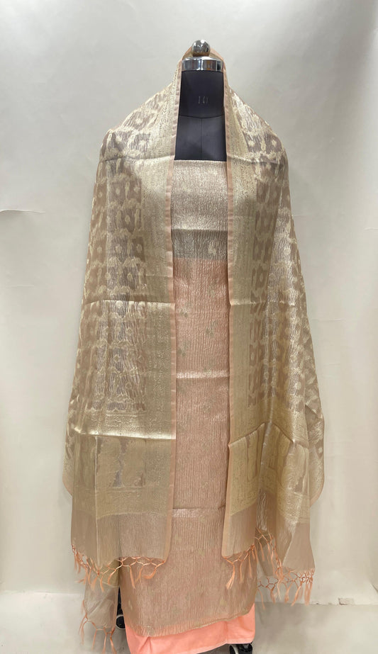 Peach tissue suit with floral zari booti, plain bottom, and checkered dupatta. SHL_82