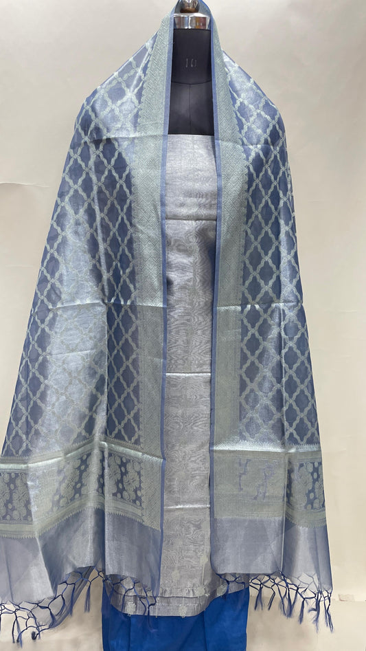 Faishana Blue Tissue Silk 3-piece Suit, Floral Zari Stripe Booti Dupatta. SHL_94
