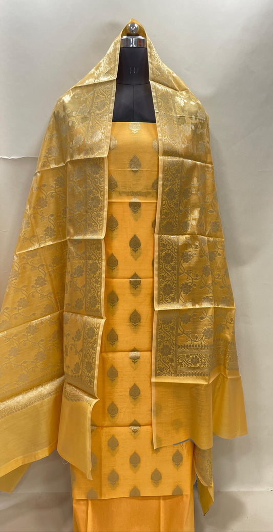 Mustard gold art silk suit set with diagonal zari stripes and matching dupatta. SHL_54