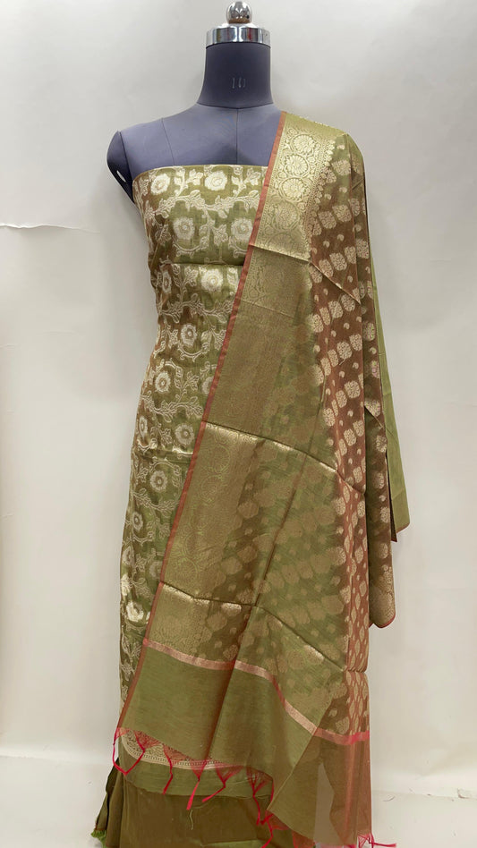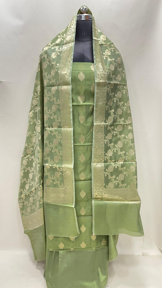 Green cotton suit featuring floral zari resham mina bootis and jaal dupatta. SHL_13