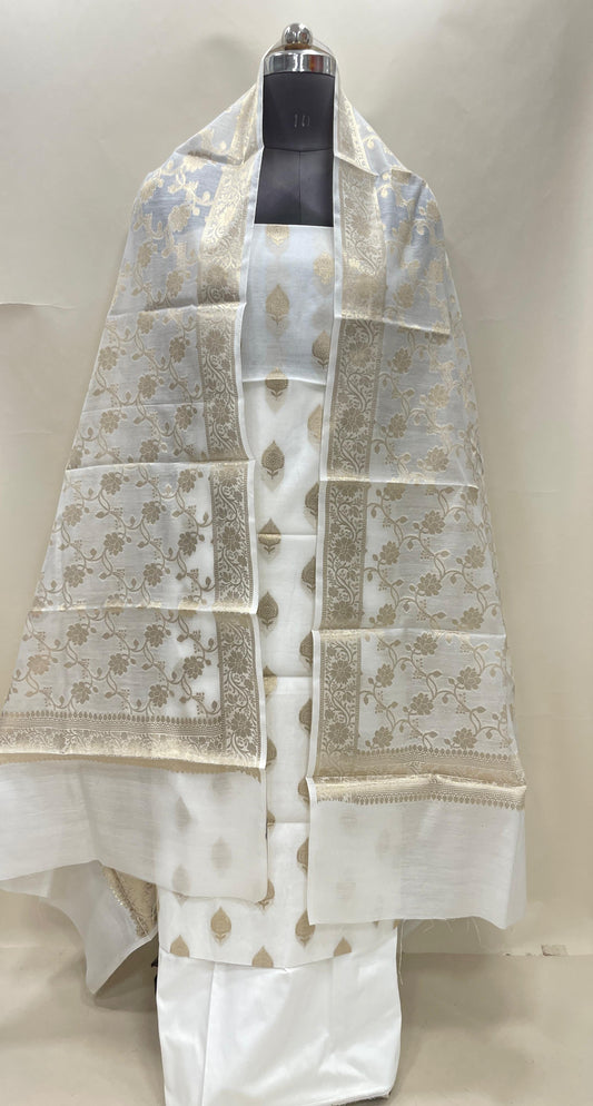 Ivory white cotton suit with diagonal resham stripes and tilfi jaal dupatta. SHL_18