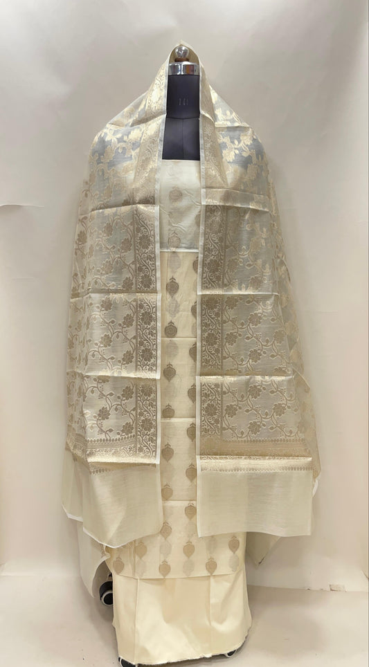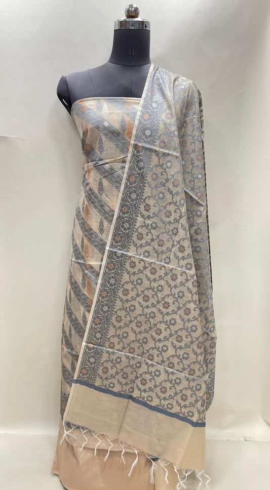 Beige cotton suit set with diagonal resham stripes and tilfi jaal dupatta. SHL_21