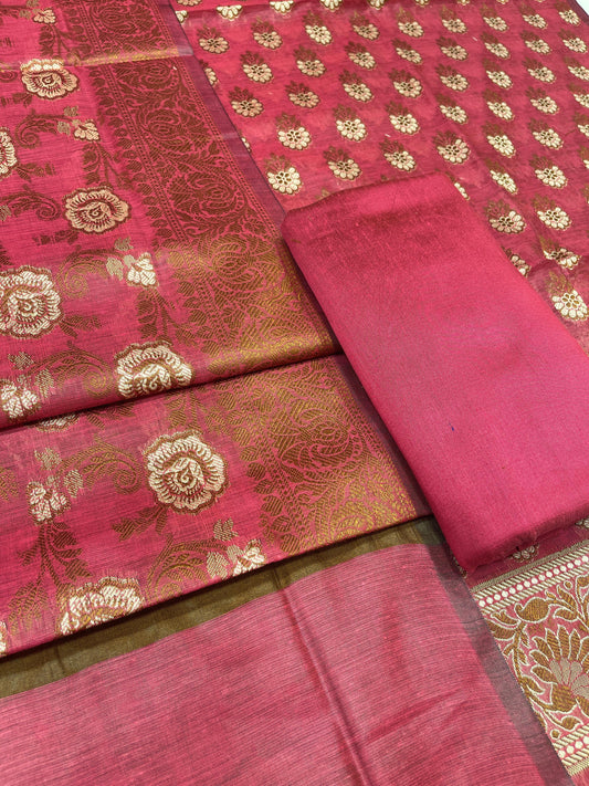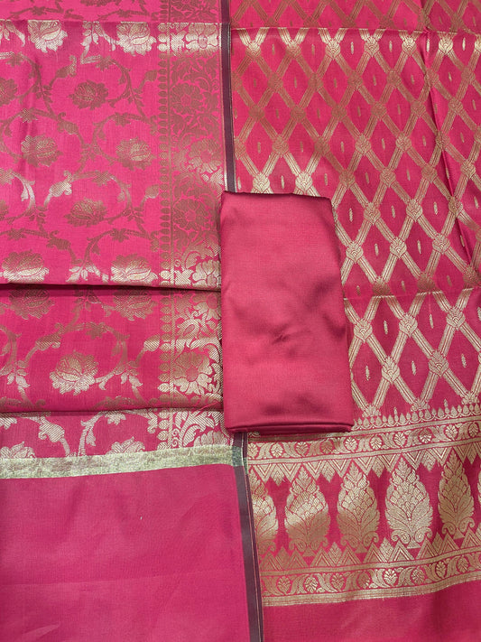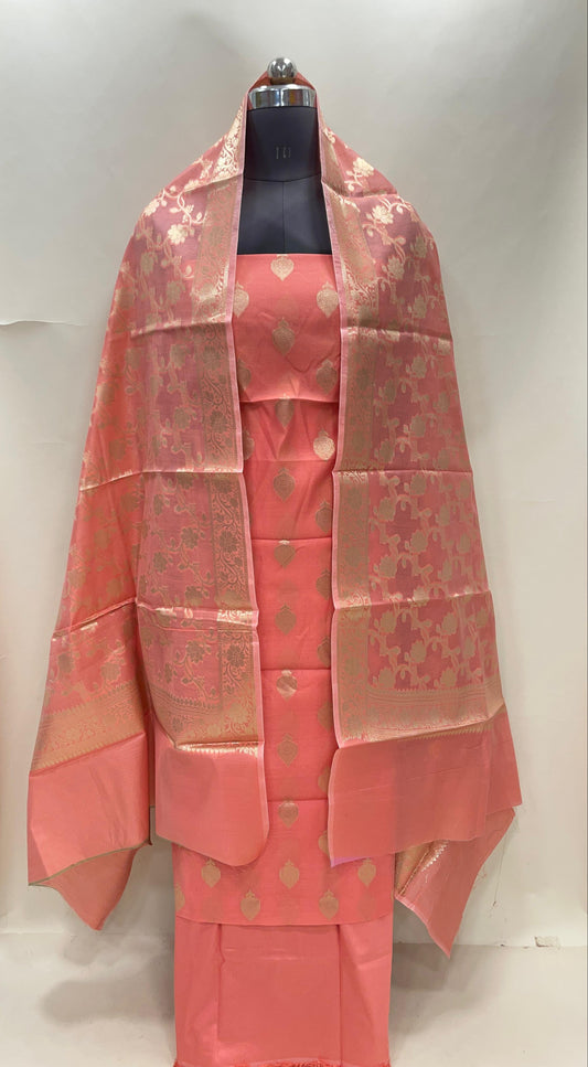 Pink art silk suit set with diagonal zari stripes and matching dupatta. SHL_52