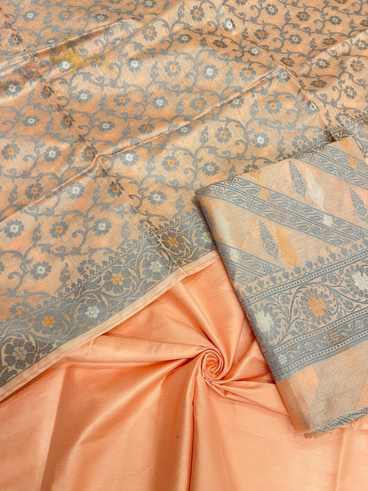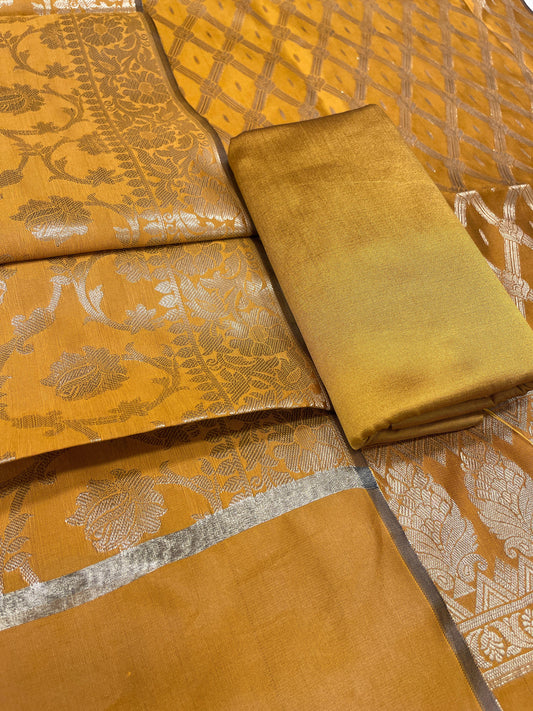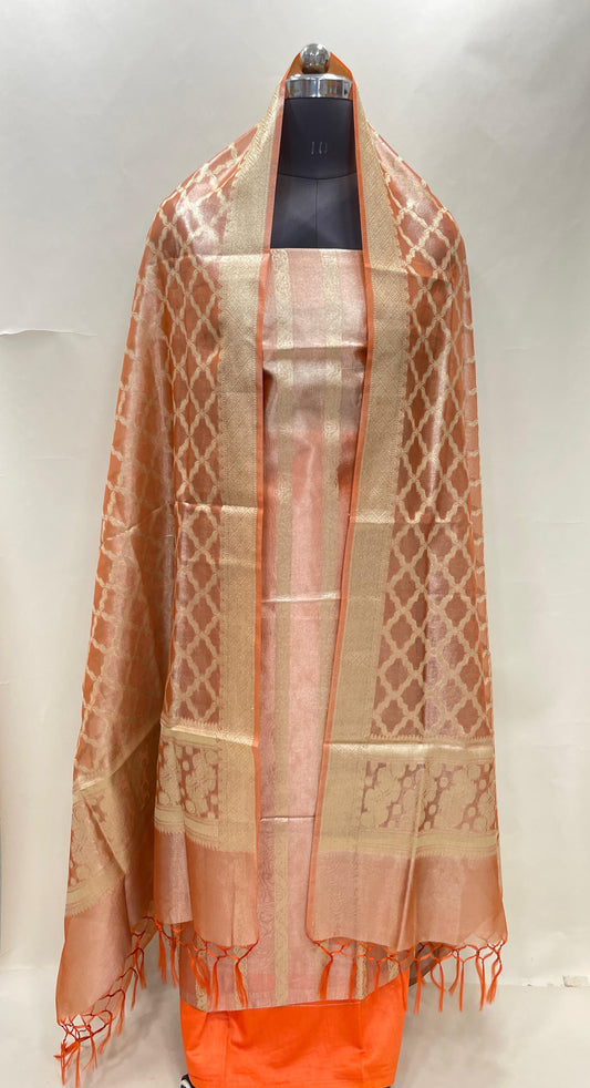 Orange tissue silk suit set with floral zari stripe and carry dupatta. SHL_75