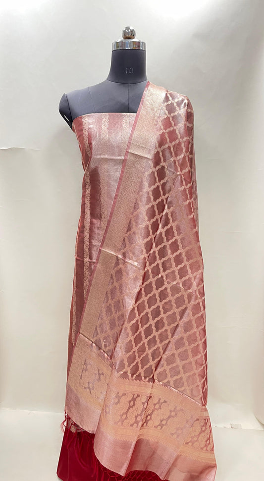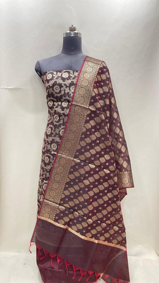 Maroon tissue silk suit set with floral zari stripe and carry dupatta. SHL_76