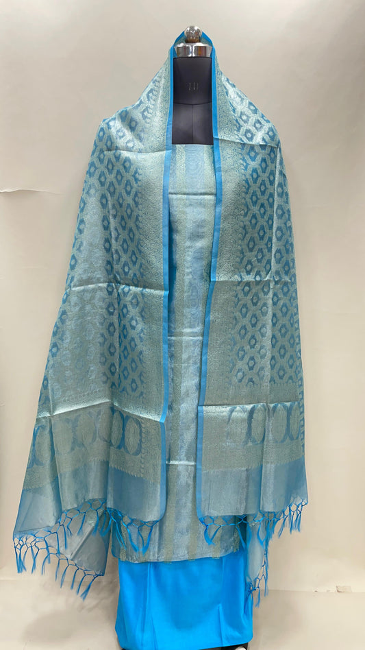 Sky blue tissue silk suit set with floral zari stripe and carry dupatta. SHL_77