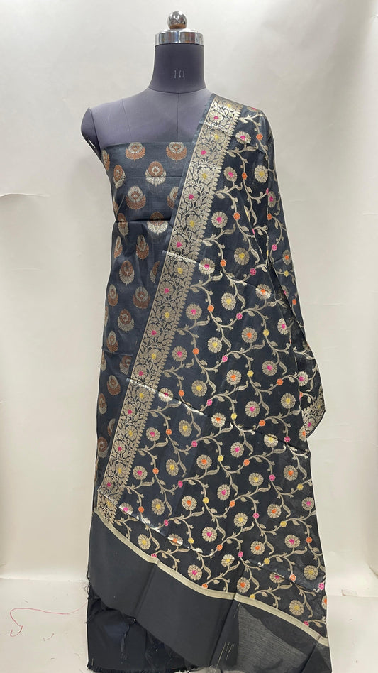 Black cotton suit with floral zari resham mina bootis and jaal dupatta. SHL_14