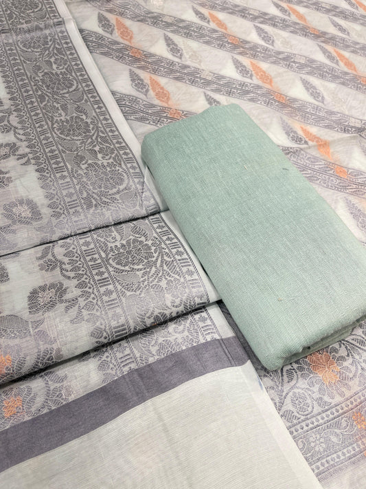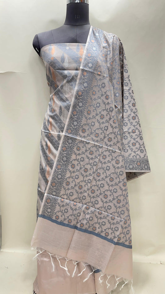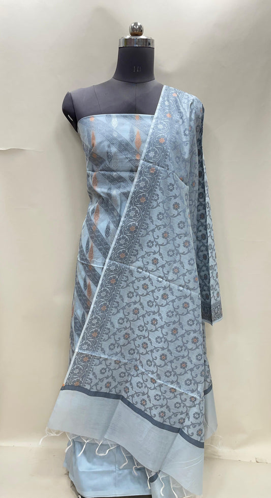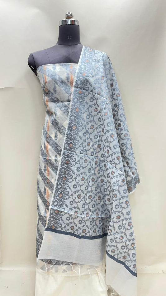 Light grey cotton suit set with diagonal stripes and tilfi jaal dupatta. SHL_20