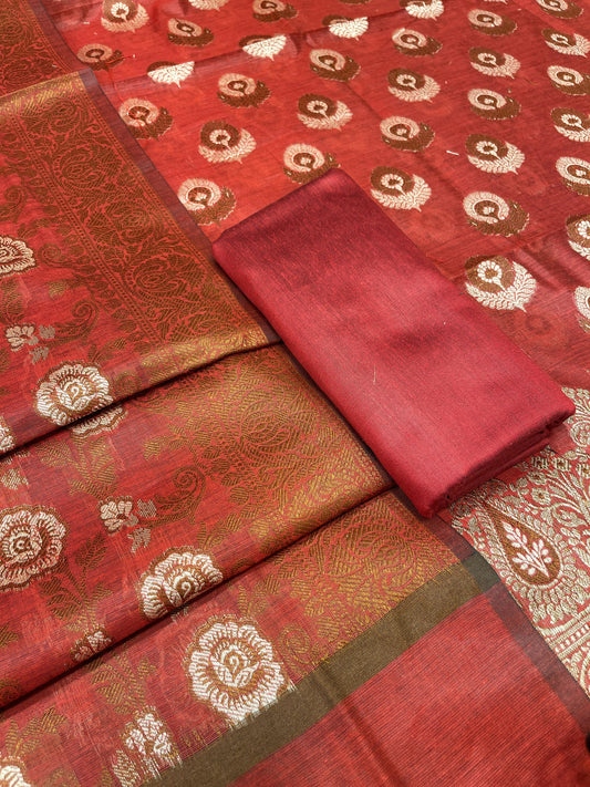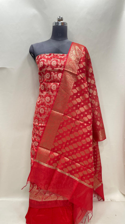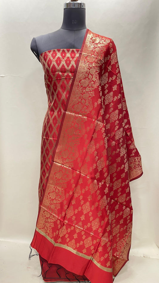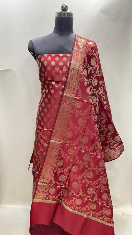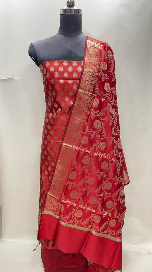 Red art silk suit set with floral zari bootas and matching dupatta. SHL_69