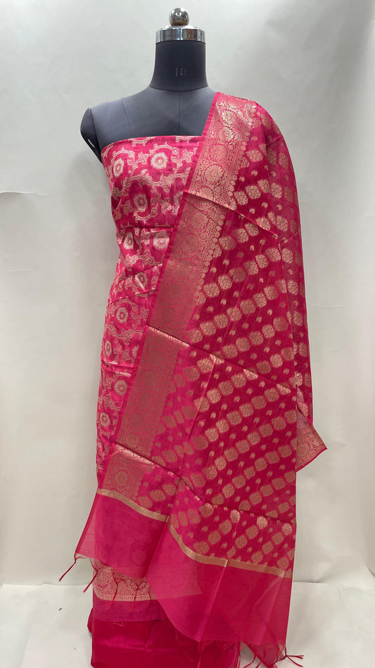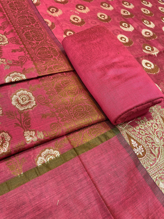 Pink cotton suit set featuring zari resham mina jaal and matching dupatta. SHL_32