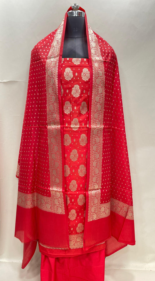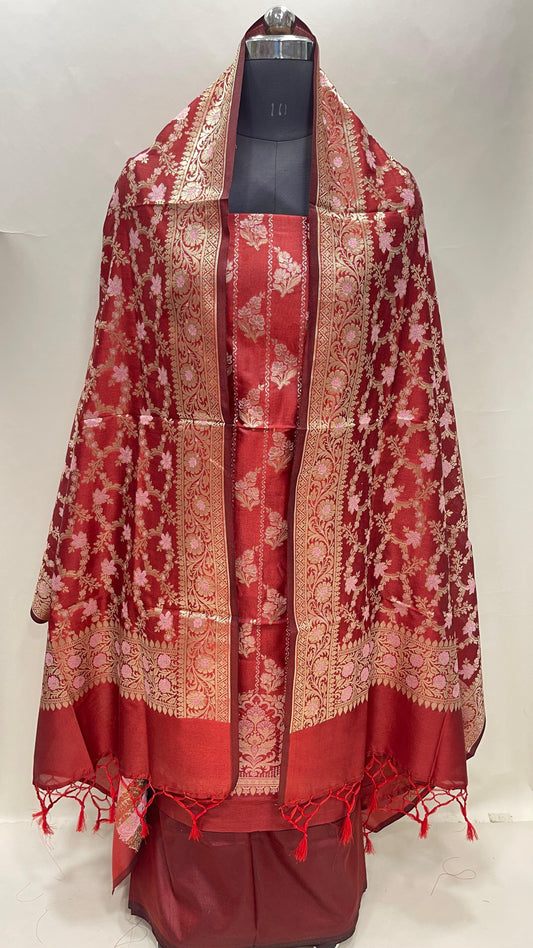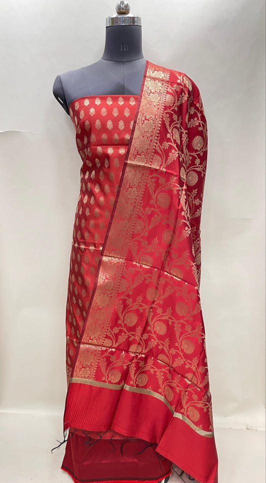 Red art silk suit set featuring floral zari bootis and matching dupatta. SHL_59