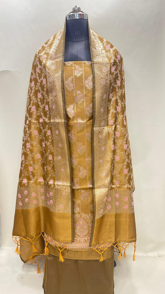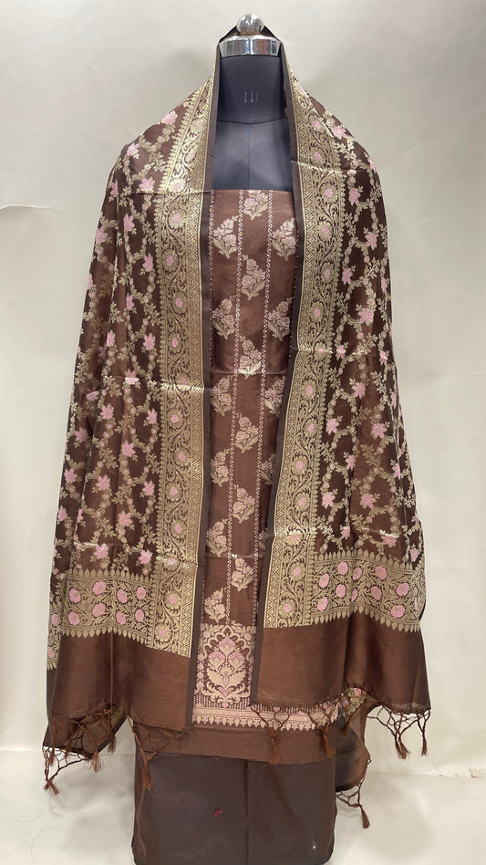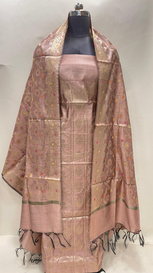 Light brown art silk suit set with floral zari bootis and matching dupatta. SHL_57