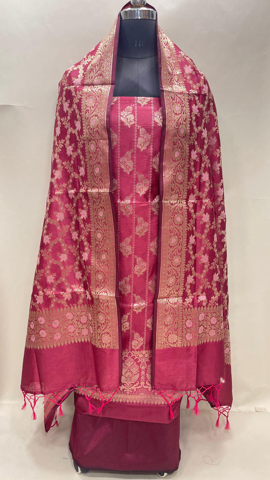 Faishana Presents Magenta Semi Katan Silk Floral Minakari Booti Stripe 3 pcs Suit Set with Plain Bottom and Minakari Floral Zari Jaal Magenta Dupatta ASD_146