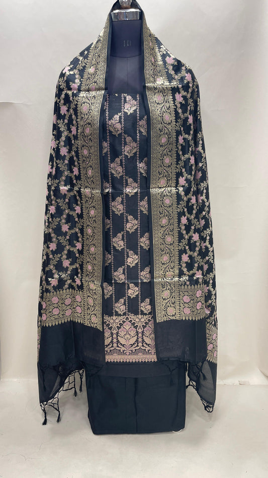 Faishana Presents Black Semi Katan Silk Floral Minakari Booti Stripe 3 pcs Suit Set with Plain Bottom and Minakari Floral Zari Jaal Black Dupatta 147