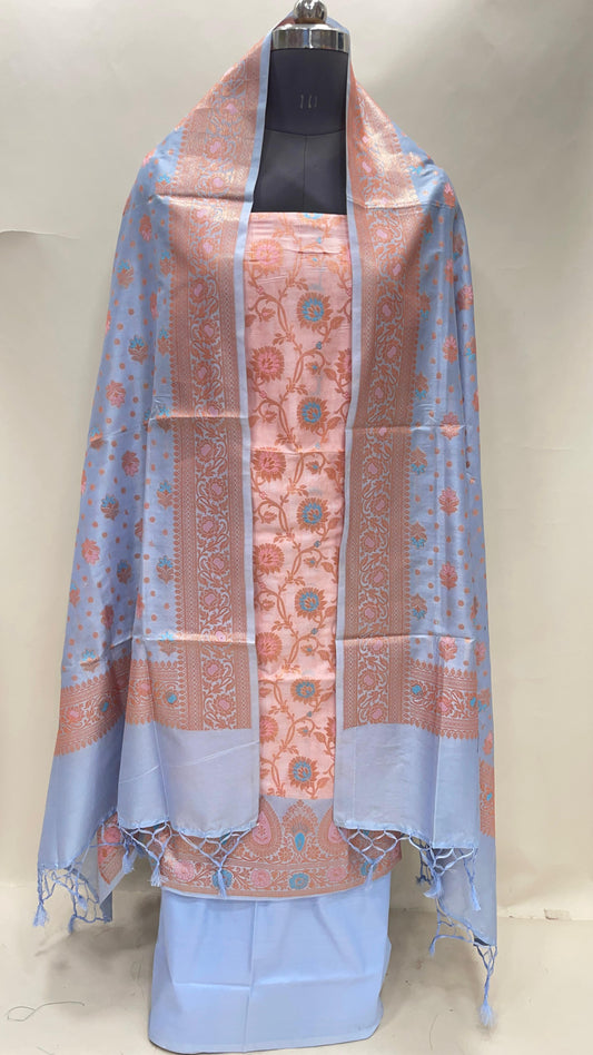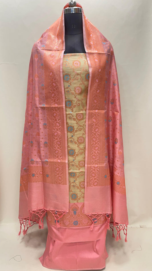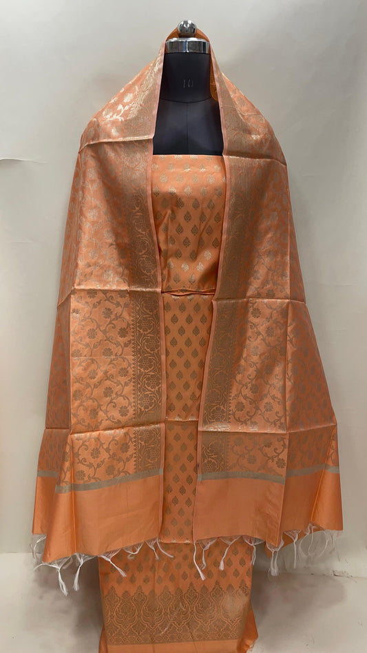 Peach art silk suit set with floral zari bootis and matching dupatta. SHL_63