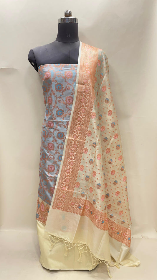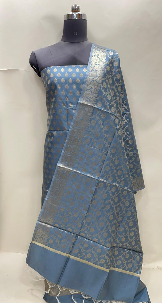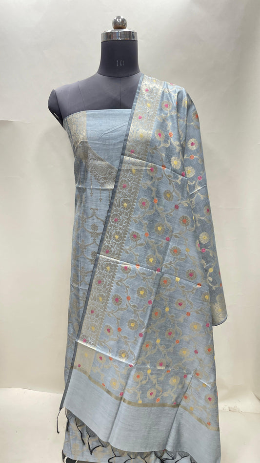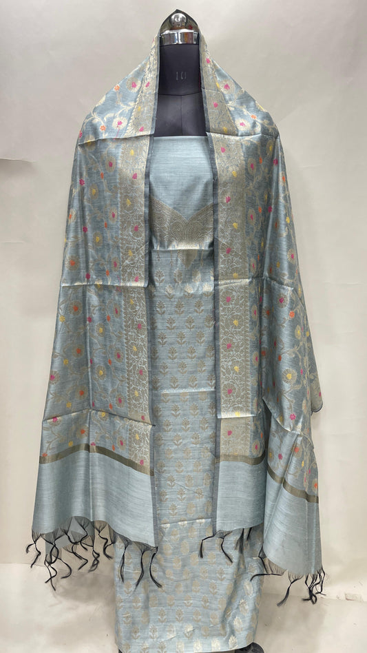 Grey art silk suit set featuring floral zari bootis and matching dupatta. SHL_66