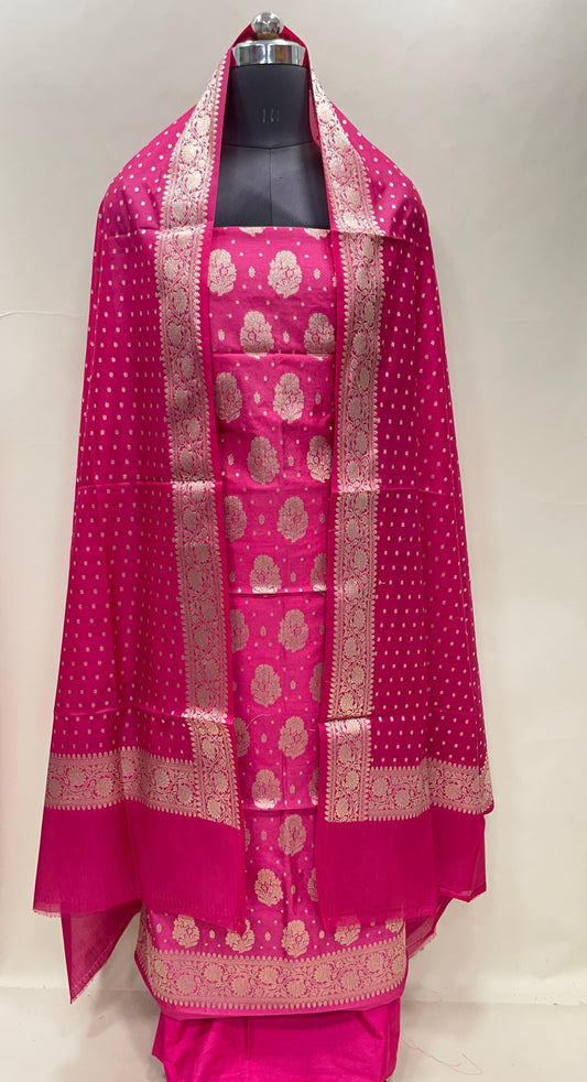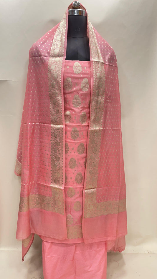 Pink semi-georgette suit set featuring floral silver zari bootis and matching dupatta. SHL_41